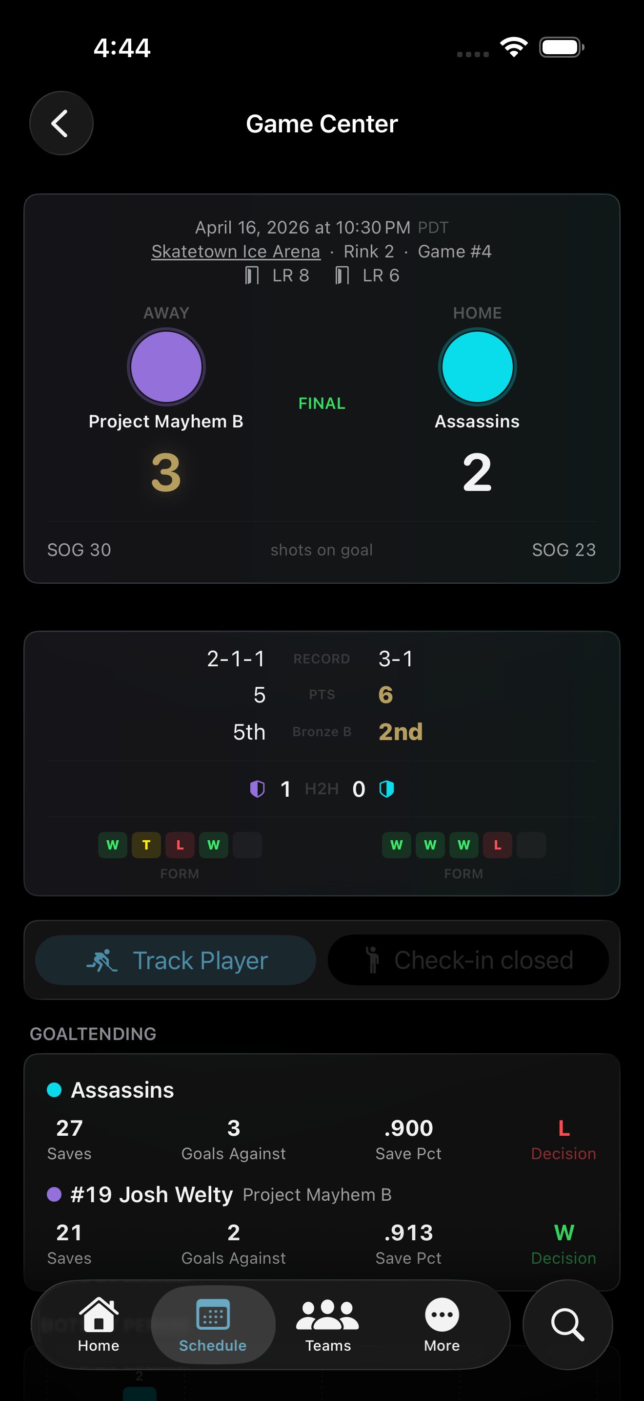 Real-time scores, shots, goals, and penalties from nine live-scoring facilities and growing. Open the app at puck drop and watch every event land the moment it happens. No refresh, no delay.