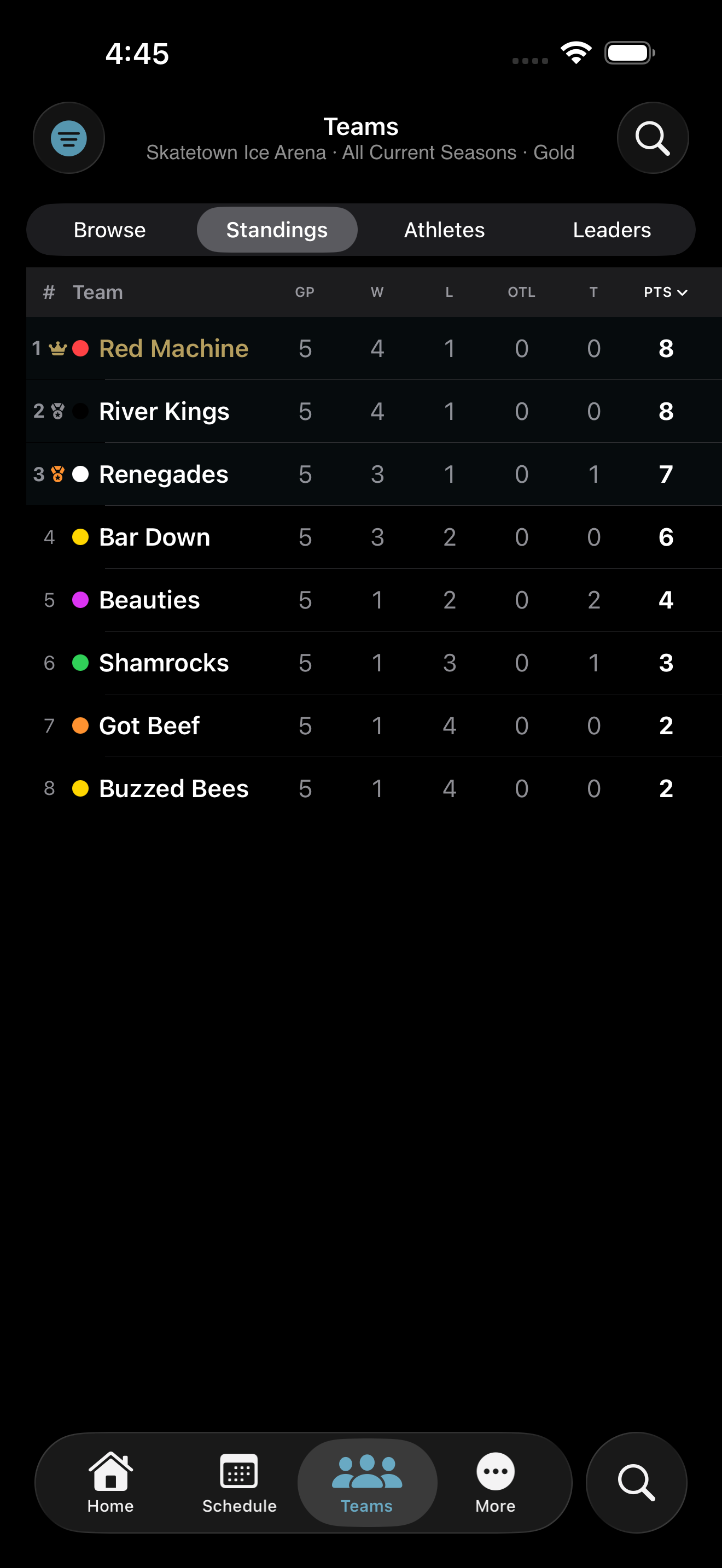 Standings update themselves after every final. Division splits, exhibition filters, and sortable tables on every device. League leaders for scoring and goaltending, plus season-over-season trend charts on every player profile.