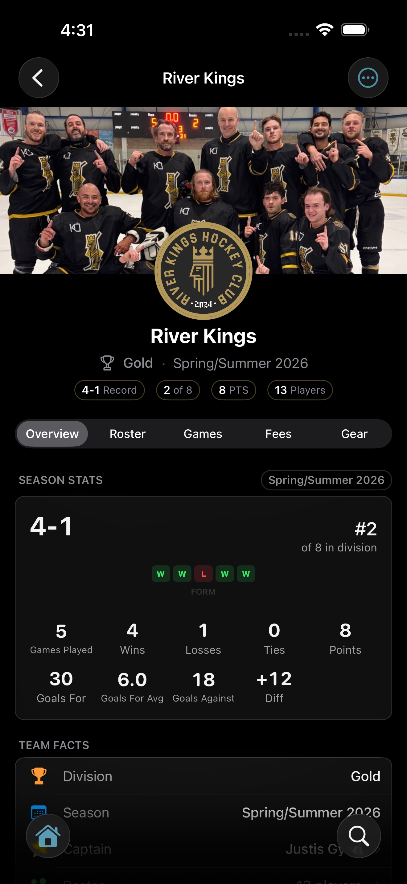 A captain card on the home screen checks your next game at a glance: goalies, defense, forwards, and who hasn't RSVP'd yet.